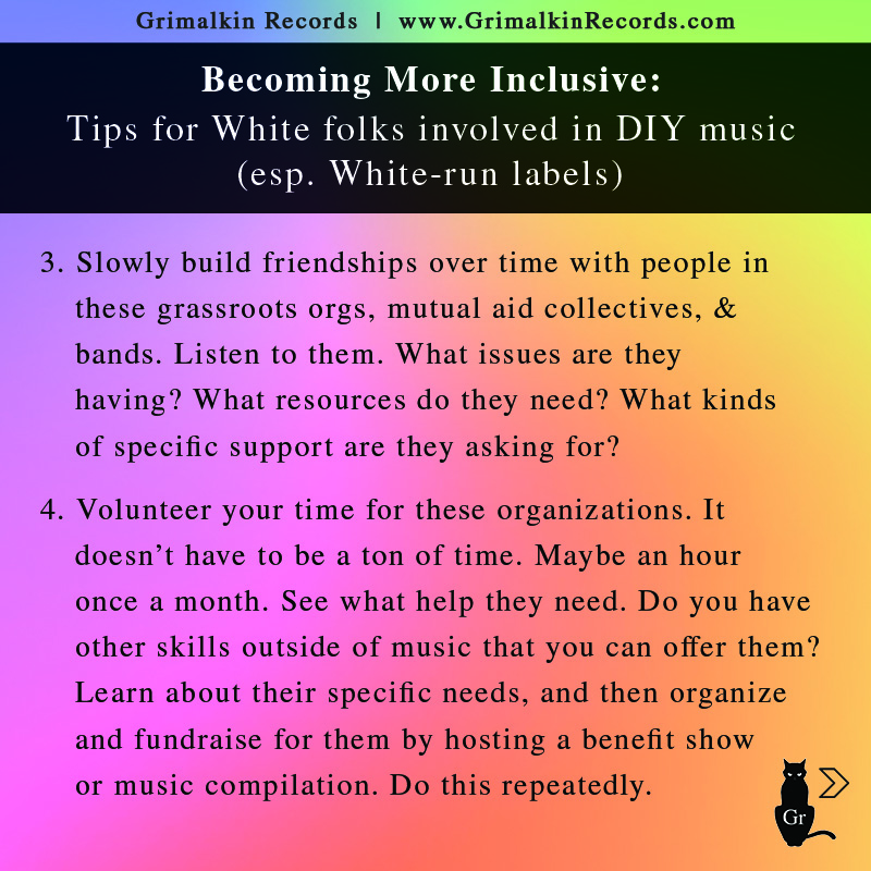 In addition to their expansive efforts to support racial justice and Black music, LGBTQ-centered label Grimalkin Records have released a list of eight steps white people can take to make DIY music more inclusive. The statement, written by the collective’s Black members, reiterates the group’s founding principle of grassroots action and offers universally actionable advice; though it’s addressed particularly to white-run labels, many of its points are applicable to anyone involved or interested in independent music. It also overlaps with more general principles of anti-racism, which are relevant even outside the bounds of art and its gatekeepers.